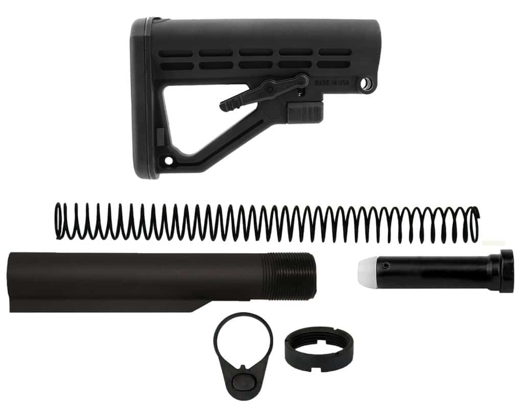 Kit Includes: (1) 6 position stock & Butt pad (1) Mil-Spec 6 Position Buffer Tube (1) Carbine length buffer spring (1) Regular End Plate (1) 3 oz. Buffer (1) Castle Nut