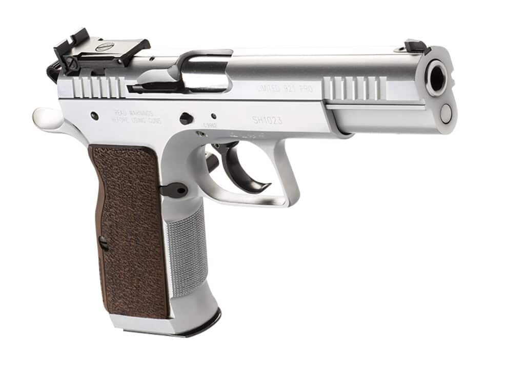 Tanfoglio IFG TF-LIMPRO-38 Defiant Limited Pro 38 Super Caliber with 4.80″ Barrel, 17+1 Capacity, Overall Hard Chrome Finish Steel, Beavertail Frame, Serrated Slide & Brown Polymer Grip