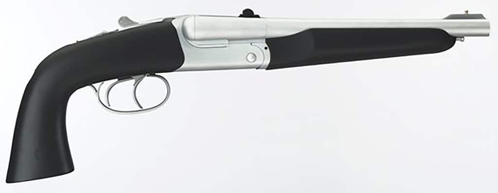he Howdah Pistol is a reproduction of the famous Auto & Burglar model made by Ithaca Company around 1920. This modern version features rifled barrels chambered for .45LC/.410 (3 inch shells) and it is sold as a pistol. The Alaskan Howdah features: matte chrome finish, tang safety, manual shell extractors, flip-up rear sight with brass bead front sight, and a walnut stock with black rubberized coating. The action works by cocking the internal hammers when the action is opened and it has double triggers to select which barrel to fire (front trigger for the right barrel and rear trigger for the left barrel). The forend piece and barrels disassemble like a traditional side by side shotgun.