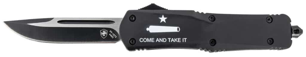 Templar Knife LCATI331 Gen II Come And Take It Large 3.50″ OTF Drop Point Plain Black Oxide Stonewashed 440C SS Blade, 5.25″ Black “Come And Take It” Aluminum Handle, Glass Breaker