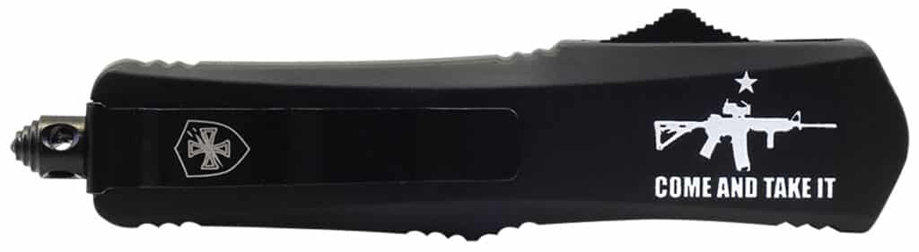 Templar Knife SAR15531 Gen II Come And Take It Small 2.69″ OTF Tanto Part Serrated Black Oxide 440C SS Blade, 4.31″ Black w/ “Come And Take It” AR-15 Gun Aluminum Handle, Glass Breaker