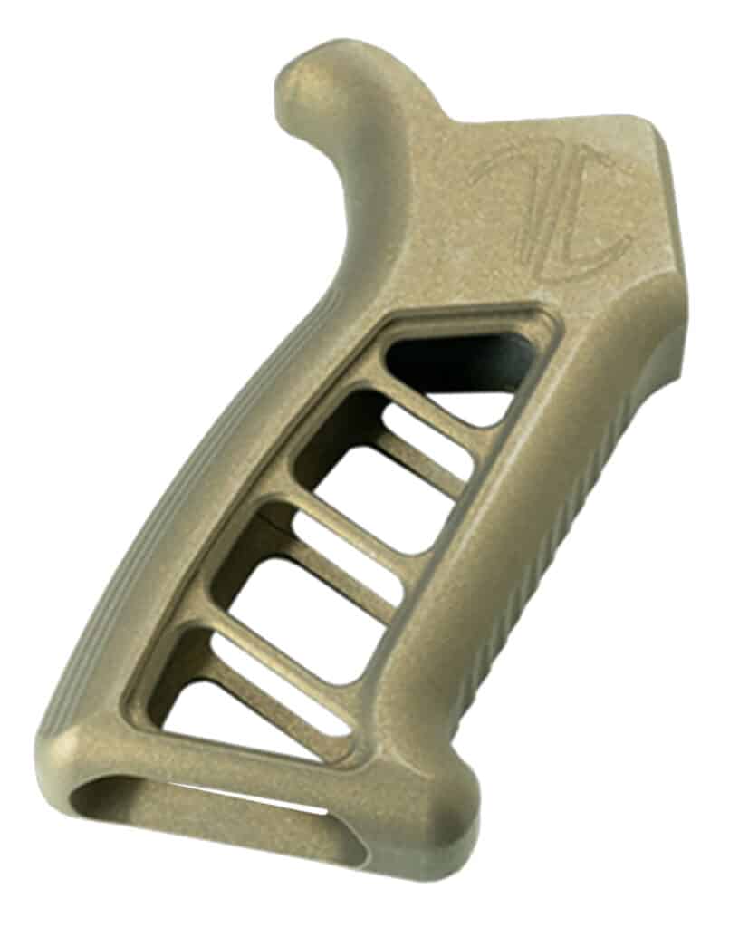 The Enforcer AR Pistol Grip is a drop in replacement that mounts to any standard mil spec lower receiver. Weighing in at just over 4oz it does not add unnecessary weight to your rifle. This skeletonized grip is CNC machined from a solid block of aircraft grade billet aluminum.