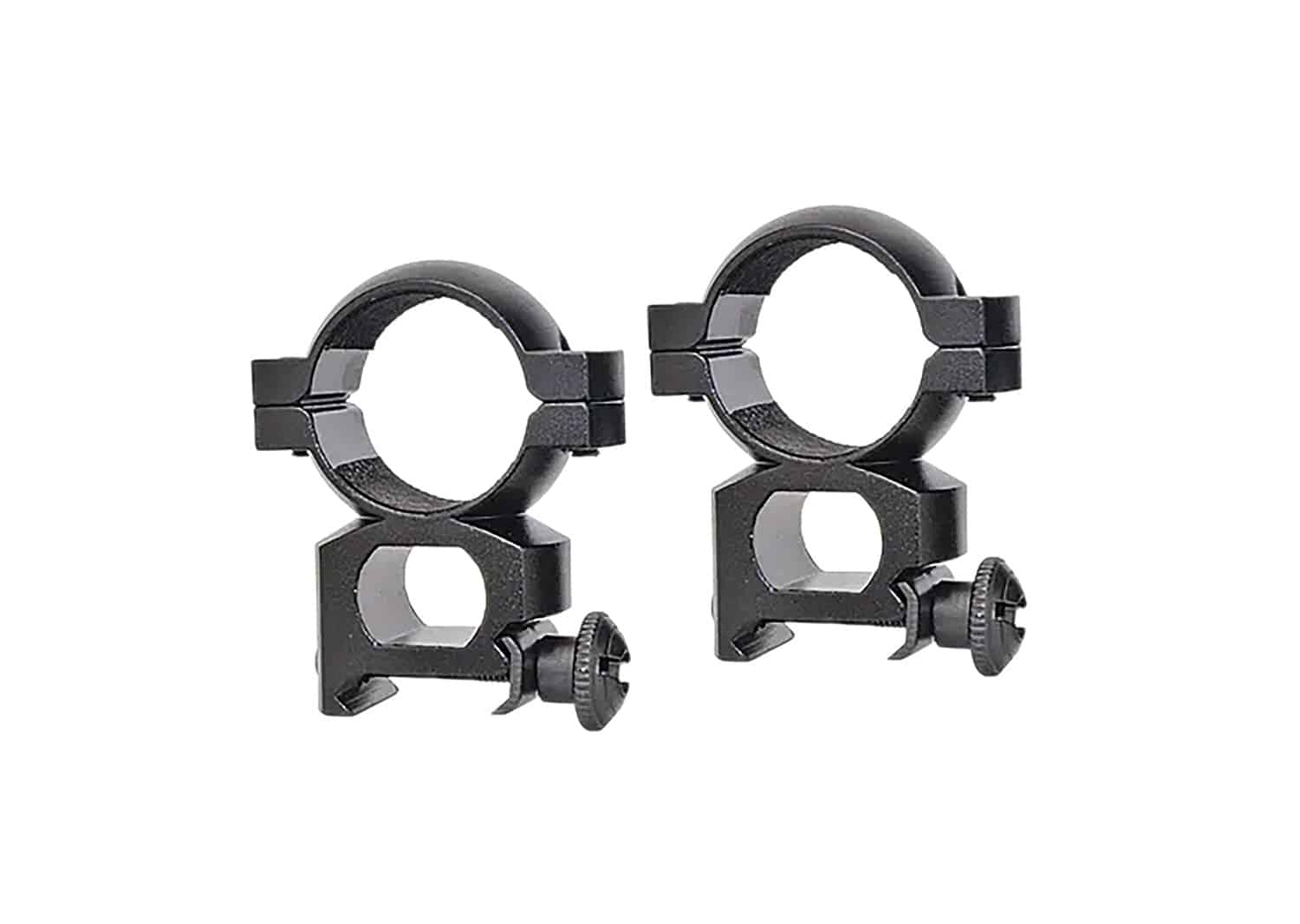 These are aluminum Scope Rings that fit .22/Airguns with 3/8″ grooved recievers. They are 1″ in diameter, Quick Peep height, top-bottom style, with a matte black finish.