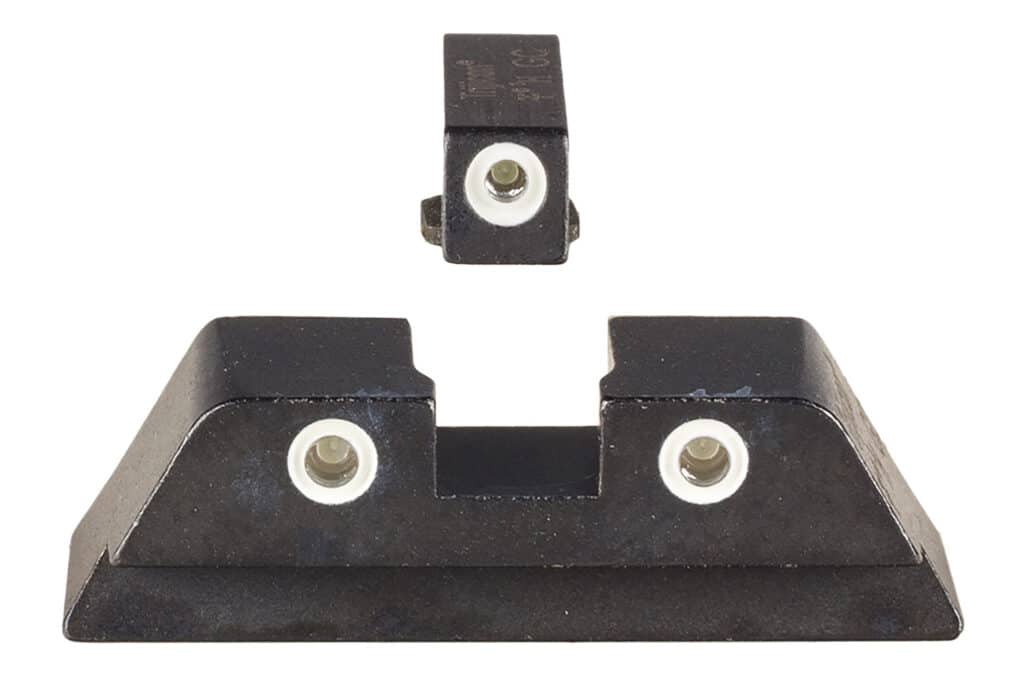 Trijicon Bright & Tough Night Sights are three-dot iron sights that increase night-fire shooting accuracy by as much as five times over conventional sights. Housed in a metal body and cushioned within silicone rubber, Bright & Tough Night Sights feature a unique shock-resistant design. Each lamp is capped with a sapphire jewel to help evenly distribute the light while protecting the lamp from solvents and puncture. Contained within aluminum cylinders for additional protection, the lamps are mounted on silicone rubber cushions to withstand shock and heavy recoil.