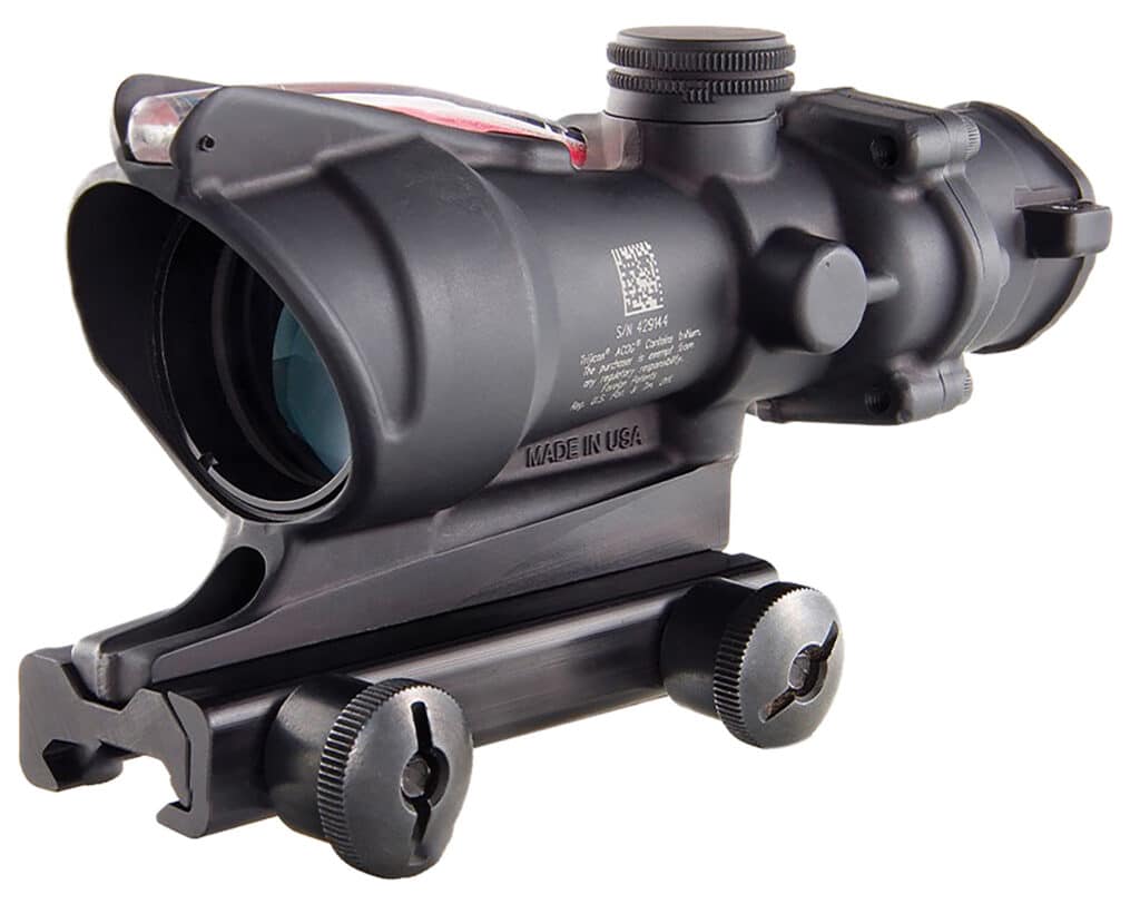 This 4×32 BAC ACOG scope provides a dual-illuminated reticle using fiber optics and tritium for a bright aiming point in any light condition. The ranging reticle is calibrated for M193 ammunition (5.56, 55gr FMJ, common military surplus) fired from a 16″ barrel. The chevron reticle is designed to be zeroed using the tip at 100 meters and the BDC goes out to 800 meters. The width of the chevron at the base is 5.5 MOA which represents 19 at 300 meters. This allows range estimation for silhouette targets.