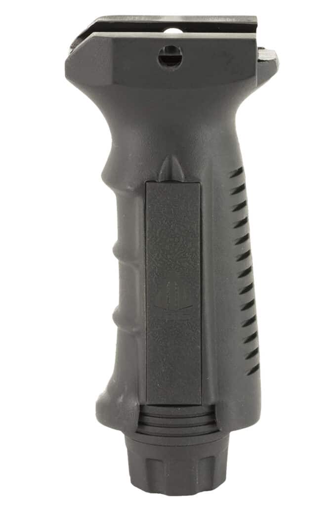 Leapers Inc UTG Vertical Foregrip has a Picatinny mounting deck, finger grooves, and an end cap for battery storage.