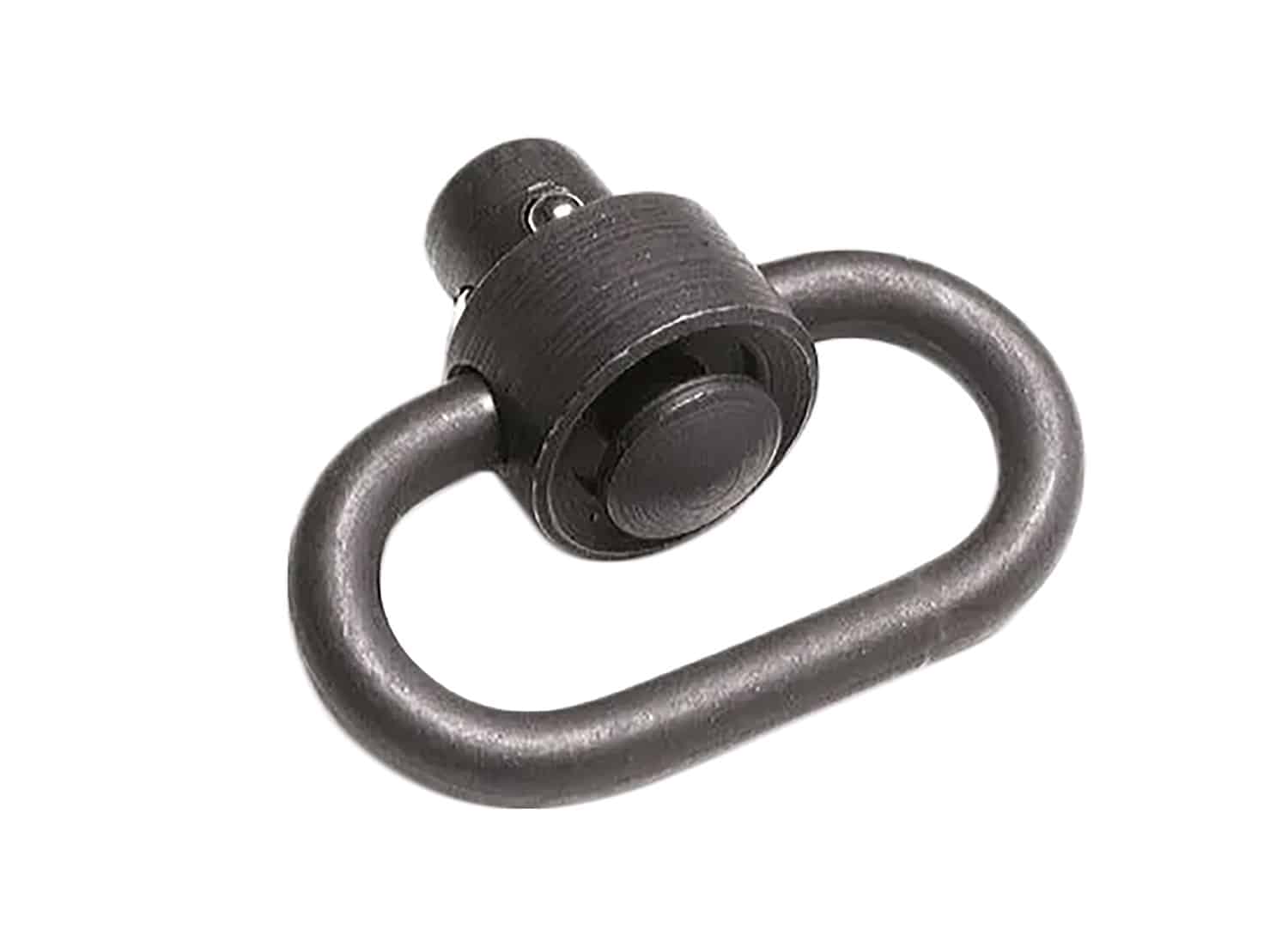 The Heavy Duty Swivel is a push button, quick detach sling swivel designed for use with any sling mount, stock or other accessory with QD socket capability. Made of steel and finished in black phosphate. The push button at the rear provides a quick and simple method of detaching the sling completely from the weapon. It rotates 360 degrees and accepts up to 1.25″ slings.