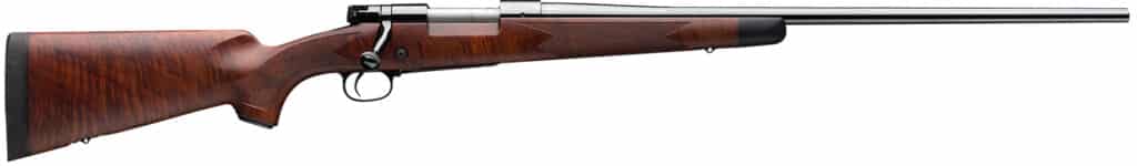 The Model 70 since 1936 it’s been the benchmark against which every other bolt-action rifle is measured. It still has the famous 3-position safety which is convenient to operate with the thumb of your firing hand, lifting the firing pin away from the sear. The forged steel receiver starts from a solid block of steel. The bottom profile of this receiver is flat to offer greater surface area for bedding. It is bedded with a two-part epoxy in two places, at the front and rear to keep things from shifting around inside the stock during firing. The classic Controlled Round Feed (CRF) bolt design is a massive claw extractor that smoothly slips onto and secures about one-quarter of the base of the cartridge. This exerts full control over the cartridge from the time it leaves the magazine, as it enters the chamber, gripping tightly until the cartridge is fully ejected. This design also allows an unfired cartridge to be extracted even if it is not yet fully chambered. The M.O.A. Trigger System is the most precise three-lever trigger system in the world and an improved fit and finish and enhanced accuracy to go along with its classic Pre-’64 controlled round feeding. A blade-type ejector gives you full control when ejecting a fired case. Its free-floating barrel is button rifled in a process that assures superior accuracy and durability. This Super Grade model features an AAA French walnut stock and polished metal finish.