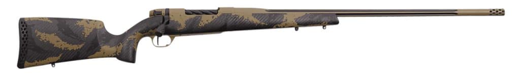 Welcome to the top of the food chain, the Mark V APEX is where long-range accuracy meets lightweight hunting. The APEX is built on the iconic Weatherby Mark V steel action and comes with a fluted two-toned cerakoted barrel. Equipped with Peak 44s Bastion stock, among the lightest production vertical grip carbon fiber stocks on the market, weighing in at just 23 ounces. It features a comfortable ambidextrous palm swell and a substantial thumb groove to promote proper form while shooting. The forend features dual sling studs to allow the shooter multiple options when deciding on accessories. This upgraded stock allows shooters to comfortably and accurately shoot from all positions not only at the range but in the harshest of conditions while in the field. Also grabbing the eye is the second generation 3DHEX recoil pad, the first production 3D printed pad the firearms world has seen. Hidden inside the pad is a series of interlocking voids that progressively collapse during recoil, expanding the time component of the recoil impulse and deadening the sharp kick of magnum chamberings. This means less felt recoil resulting in better accuracy downrange. More pronounced spiral fluting on the bolt body not only trims weight but also reduces the bearing surface within the action and results in smoother bolt function. Fit with Weatherbys highly-effective Accubrake ST, this brake is blended to match the profile of the muzzle. With 30 symmetrically-spaced ports that help harness the recoil, it tames even magnum chamberings.