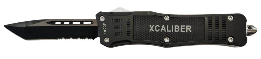 Xcaliber Knife Company 40 Cal Large 3.80″ OTF Tanto Part Serrated Black 440C SS Blade, 5.30″ Steel Handle
