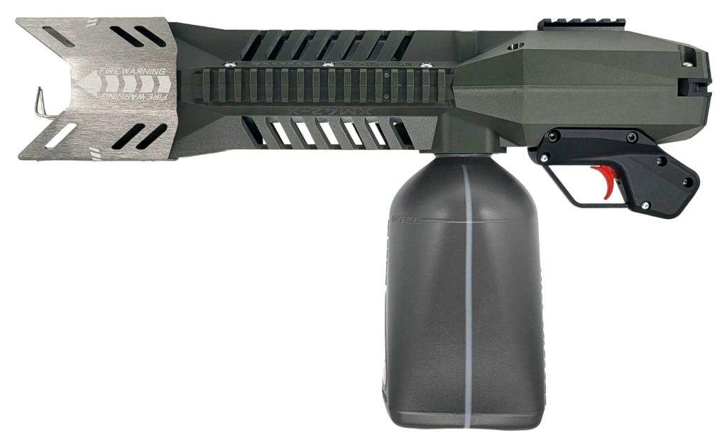 *Banned in Maryland, requires a pyrotechnic license in California With an innovative polymer housing and robust spark ignition system, the XM42-X, is the most technologically advanced consumer flamethrower currently on the market. Taking cues and direction from the consumer, XM42-X was designed to be a fully modular system. By utilizing the different grip options currently available, along with the complete rail system built in, it can be fired in whatever configuration the operator requires!