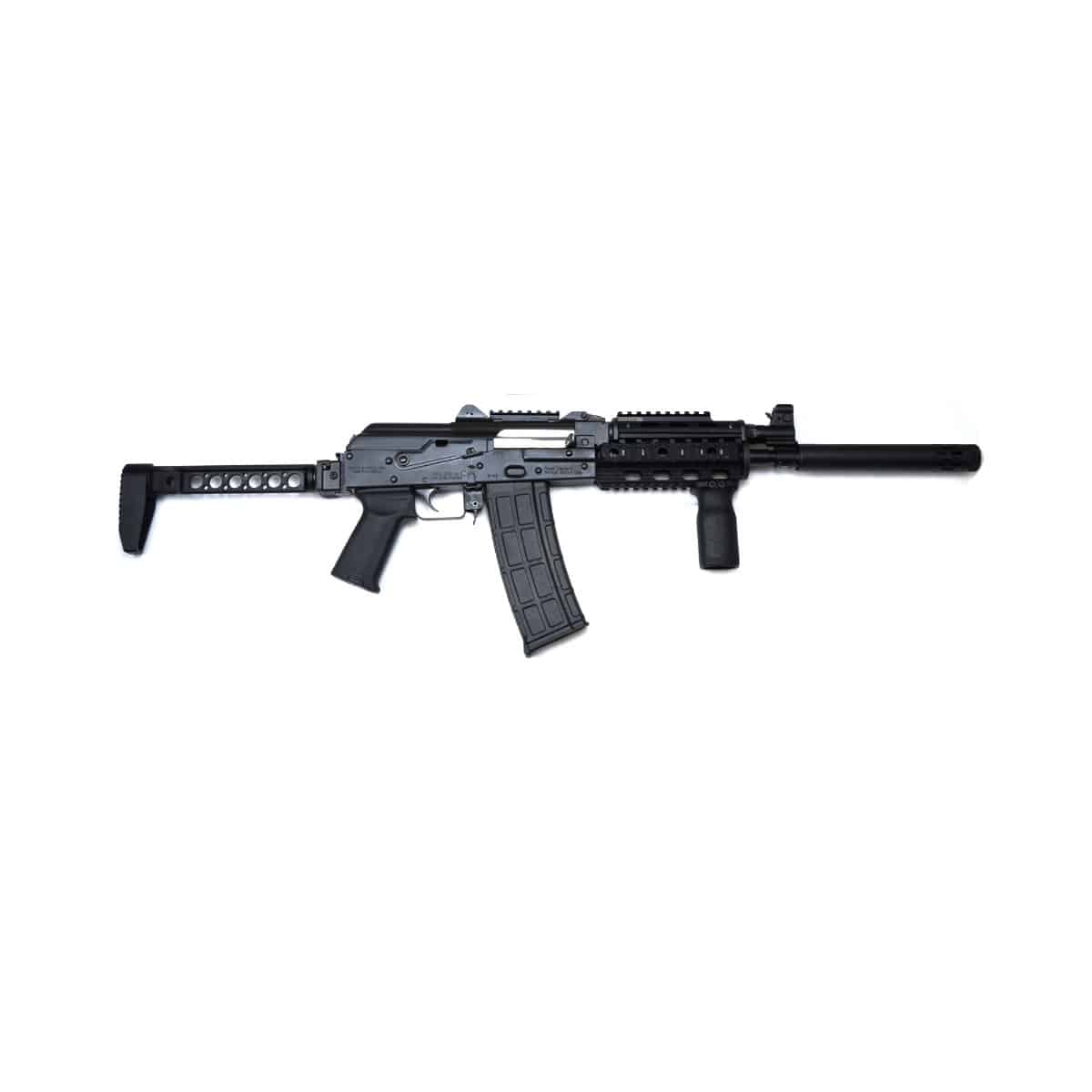 Features: 5.56x45mm/.223 caliber Semi automatic action 30 +1 round capacity 16.5″ Barrel w/pinned and welded extension Chrome Lined Barrell Stamped steel 1.5mm receiver with bulged trunnion Corrosion resistant hard nickel molly steel bolt carrier Hinged top cover Bolt hold-open notch on the safety selector Krinkov style rear, post front sights Magpul Grip Quad rail handguard Magpul RVG Vertical Grip 34″ Overall Length/26″ Folded Weight is 8.3 lbs. Top rail Muzzle Extension Rear Pic Rail Adaptor Midwest Industries LWS Folding Stock